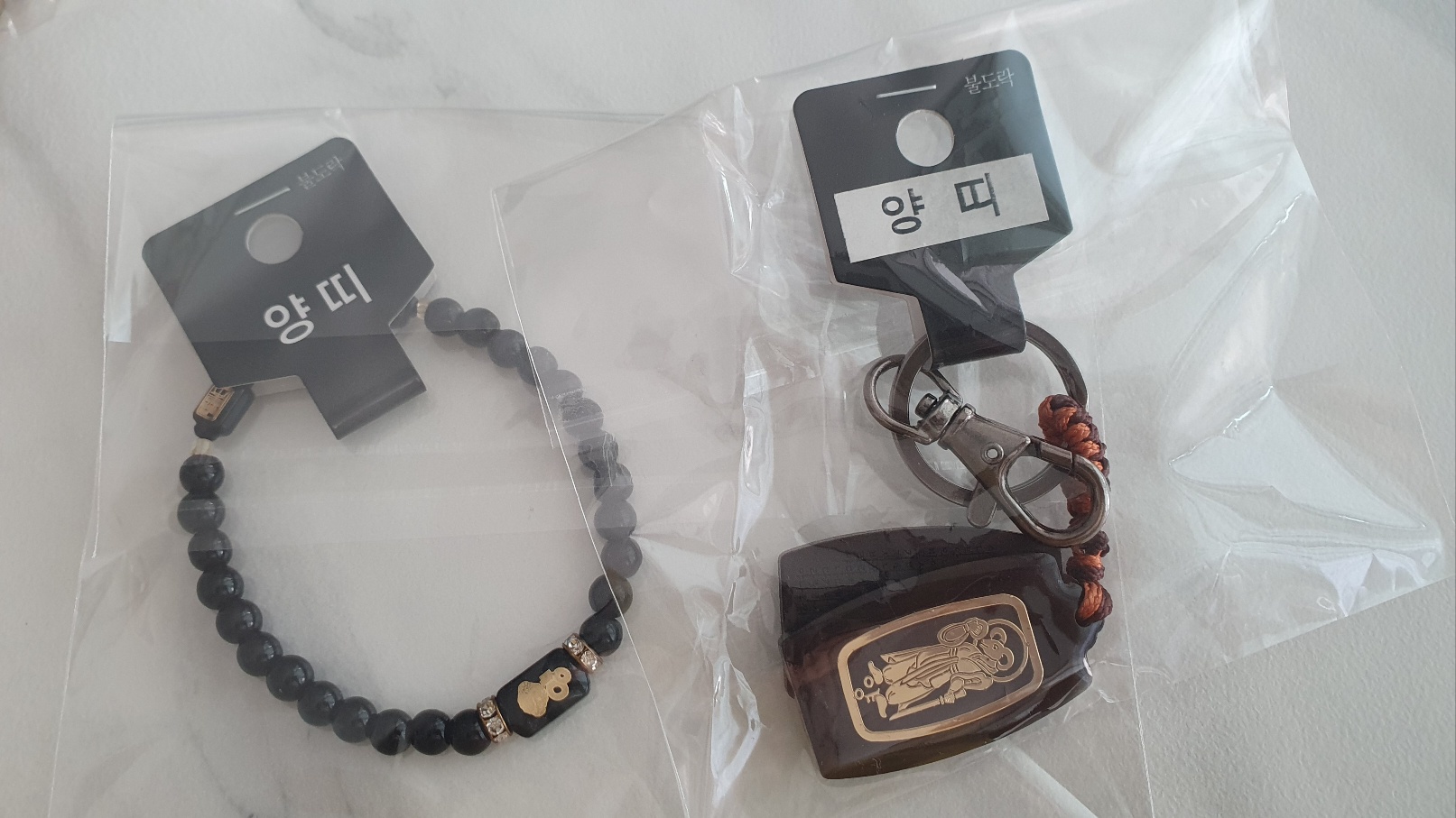 너무너무 예쁜 염주들과 다양한 불교용품을 판매했는데요, 저는 저희 부모님과 시부모님께서 나이가 같으셔서 개띠와 양띠가 들어간 팔찌와 열쇠고리를 구매했답니다.