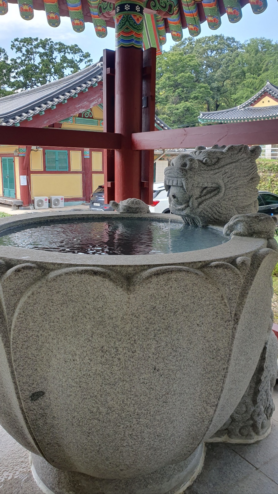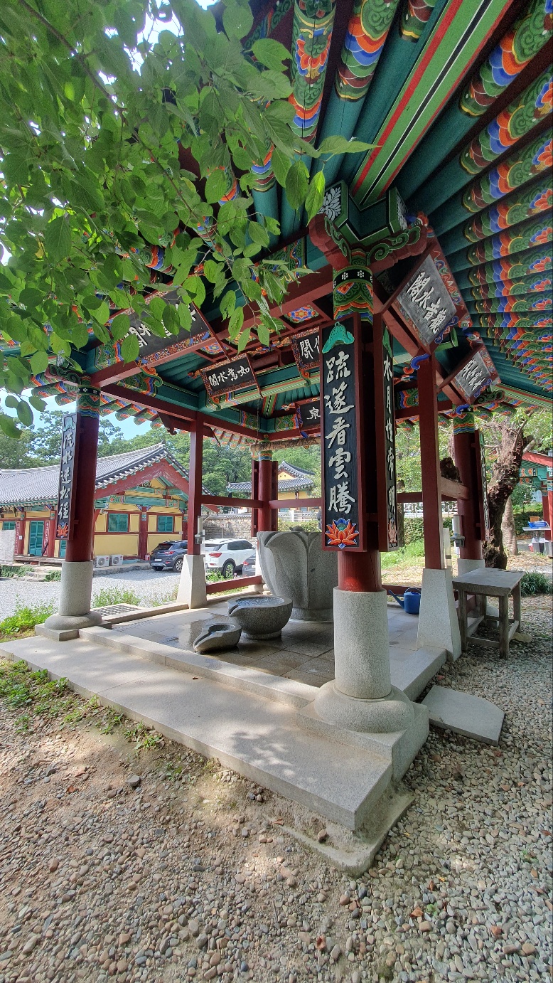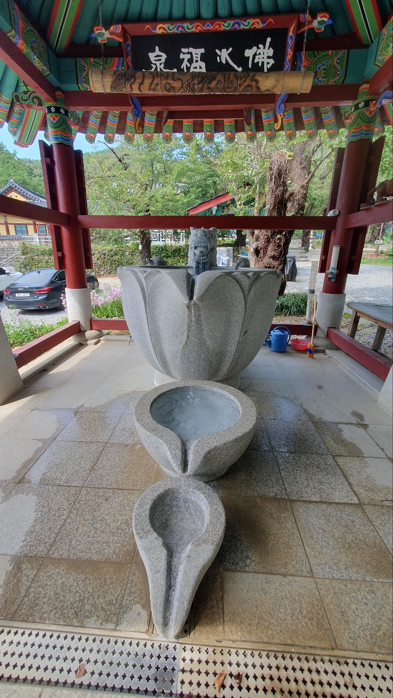 가장 먼저 물을 마실 수 있는 커다란 무량수각이 보입니다. 옆쪽으로 종이컵이 구비되어 있어 목을 축일 수 있습니다. 용의 입에서 물이 흘러 떨어지는데 꽉 차있는 물을 보기만 해도 시원함을 느낄 수 있었답니다.