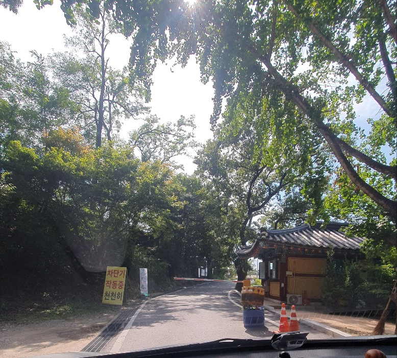 신원사를 빠져나오는 길에 사진을 찍었는데요, 매표소 같은 건물과 차단기 가 보입니다. "주차장이 밖에 있나??'하고 고민하고 있을 때 직원분께서 "몇 분이세요~?"하고 물으시며 차단기를 올려주셨습니다. 차단기 보고 겁내지 마시길!