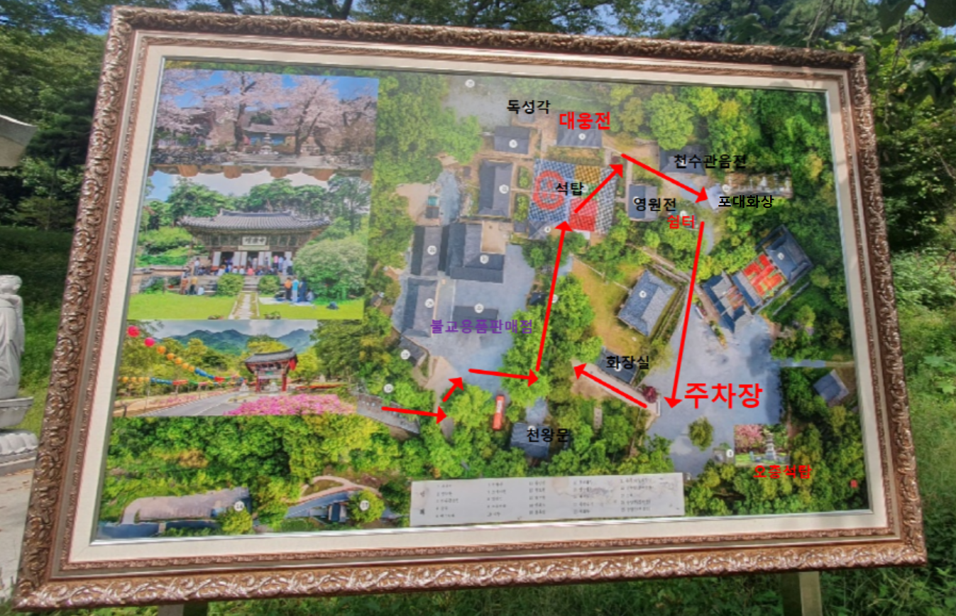 관음수각→대웅전→배롱나무→천수관음전→힐링, 명상 쉼터→표대화상→주차장