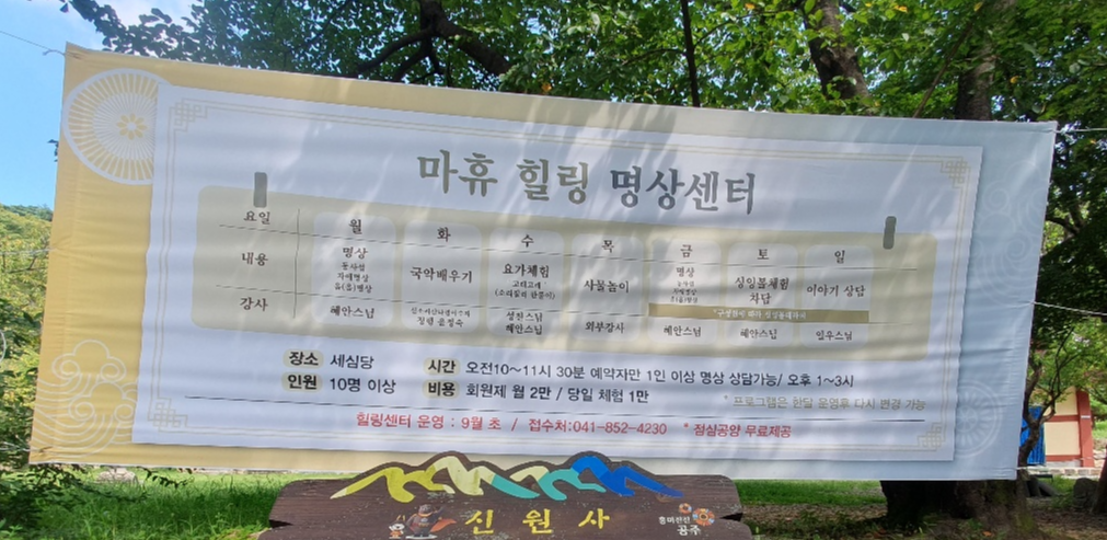 신원사에는 힐링 명상센터를 운영하고 있는데요, 명상을 시작으로 국악 배우기, 요가체험, 사물놀이, 싱잉볼체험, 차담과 이야기 상담을 끝으로 정말 폭넓고 다양한 활동을 하는 것을 볼 수 있습니다.