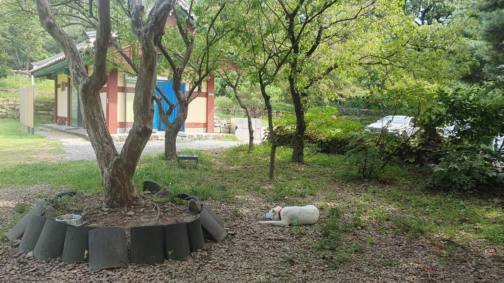 주차장을 나와 불교용품점이 있는 곳으로 내려가는 길 오른편에 벽수선원이 다시 보입니다. 벽수선원 옆쪽에 화장실이 있고 그네의자 옆쪽으로 백구 한 마리가 있었답니다. 너무 귀여워서 인사를 하려 했는데 으르렁~~ 하며 인사하네요.