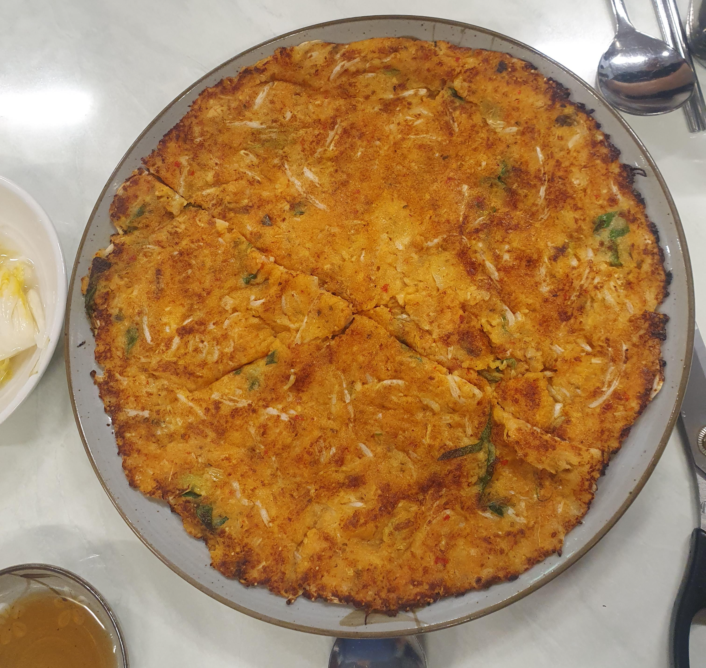 먼저 뜨끈뜨끈한 녹두빈대떡 나왔습니다. 맛을 보았는데 김치가 들어있어 느끼하지 않아 좋았답니다.