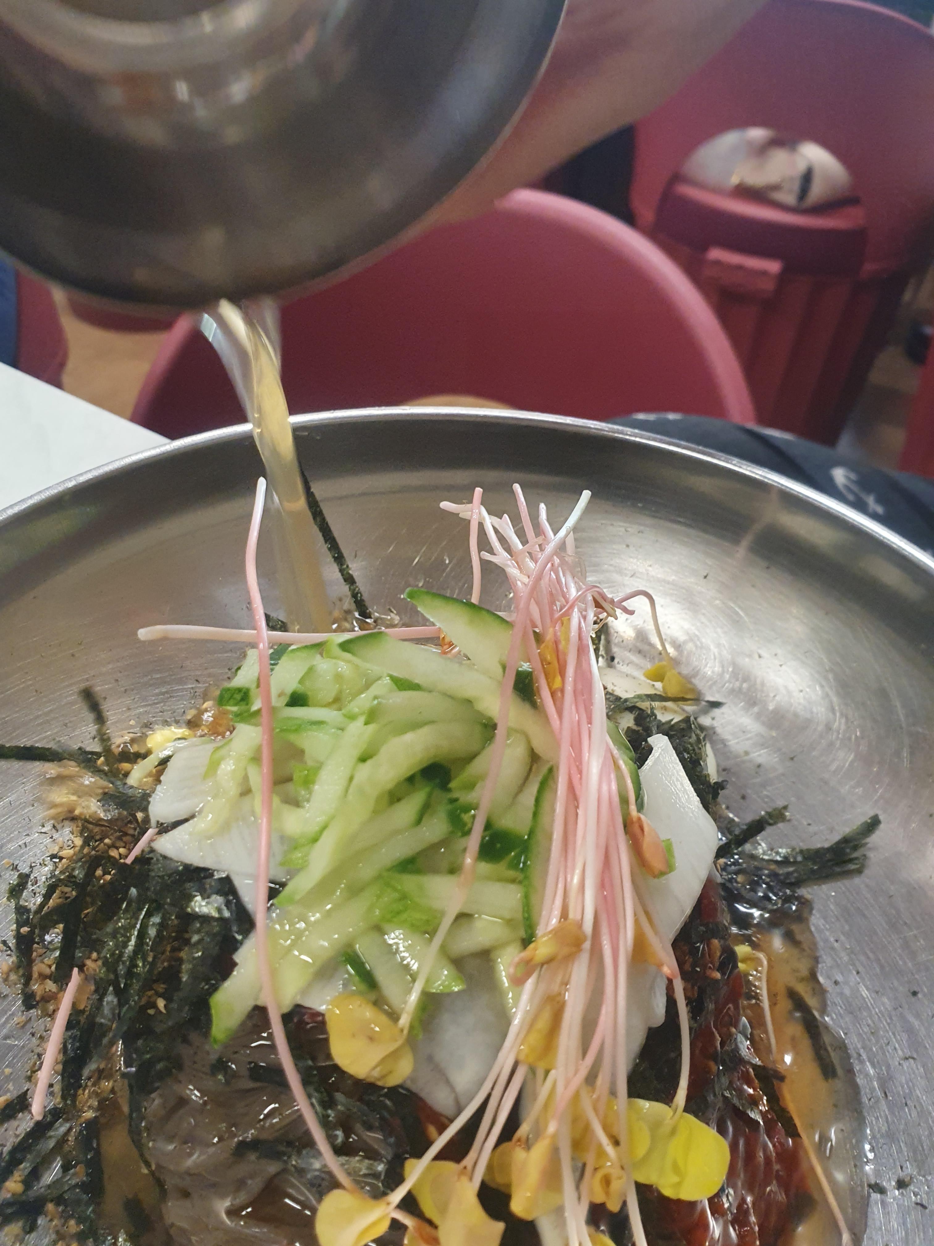 비빔은 살얼음 육수가 함께 나오니 취양에 맞게 넣어 드시면 되고 추가로 달라고 하면 주시니 필요시 요청하시면 됩니다.