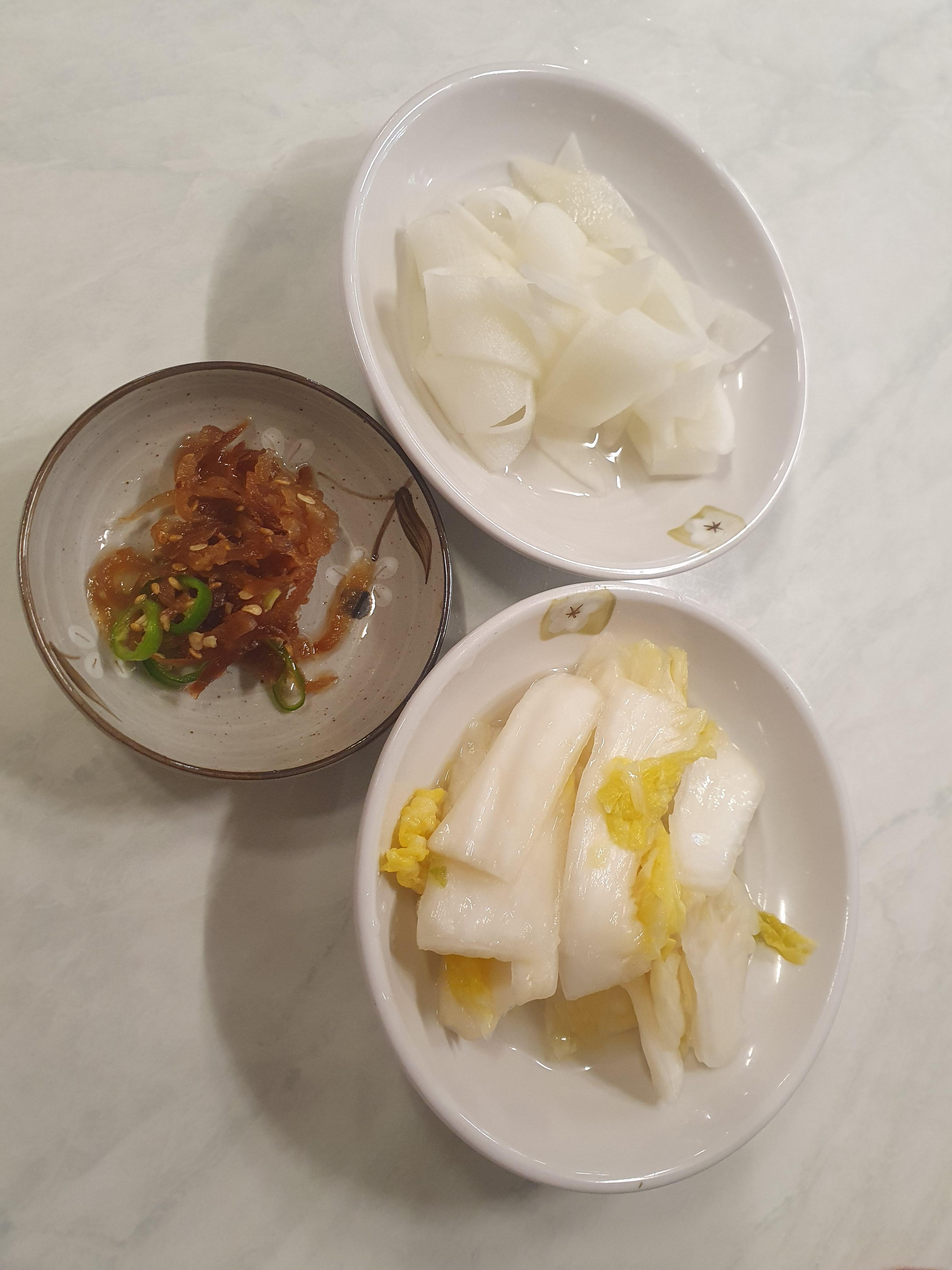 기본 반찬은 무절임과 백김치와 무장아찌가 나오는데 백김치가 아삭아삭하고 새콤달콤 맛있습니다.