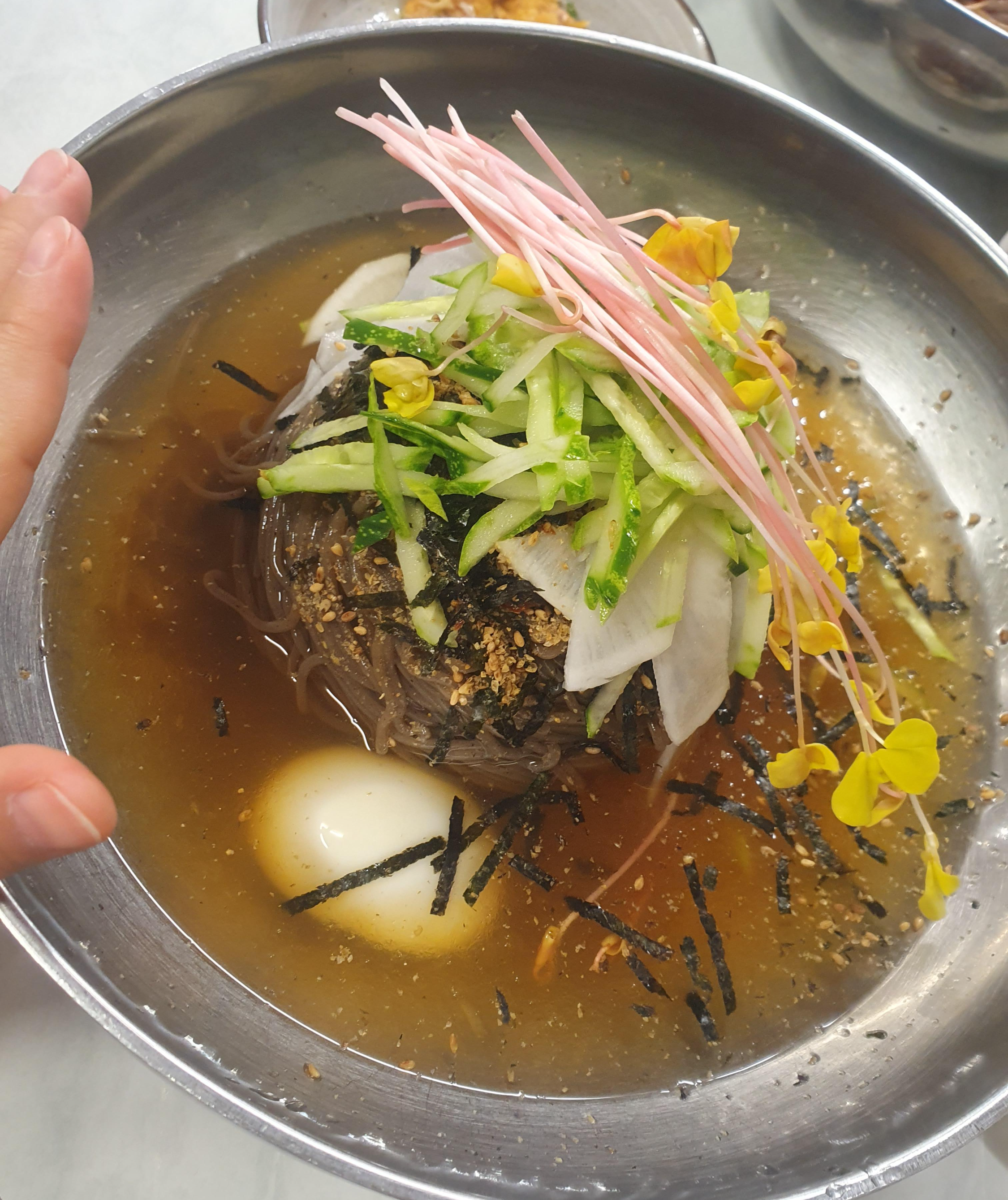 뒤를 이어 제가 주문한 물 메밀막국수가 나왔습니다. 비빔국수와 비주얼은 똑같은데 양념장 없이 시원한 살얼음이 들어 있는 육수가 많이 들어 있습니다. 그냥 먹었을 때도 맛있었는데 저는 새콤한 것을 좋아해서 식초와 겨자를 한 바퀴씩 돌려 넣어줬답니다.