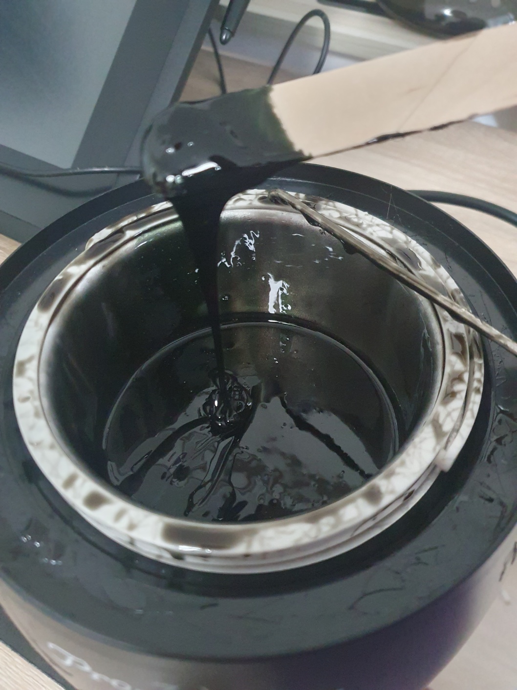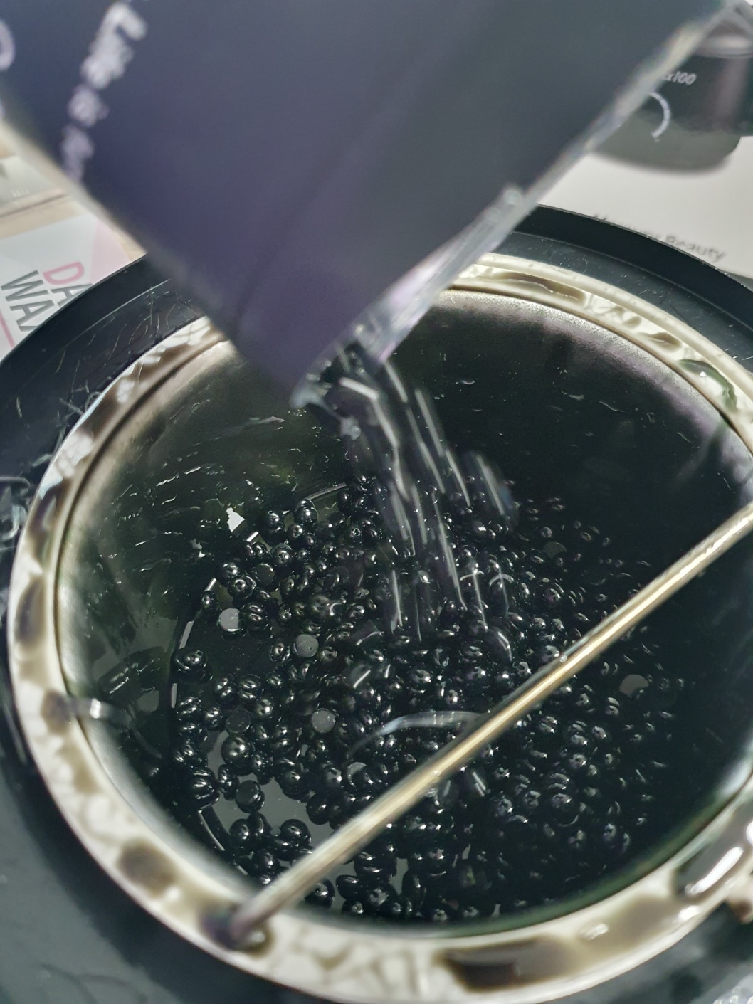 왁스를 적정량 바스켓에 부은 후 다이얼을 맥시멈으로 돌려준 후 왁스가 녹으면 사용온도로 변경 후 왁스가 굳지 않도록 저어줍니다. 사진에서는 너무 많이 녹여져 있는 상태인데 저상태로 바르면 남편이 "아 뜨거워!! 하고 소리를 친답니다.