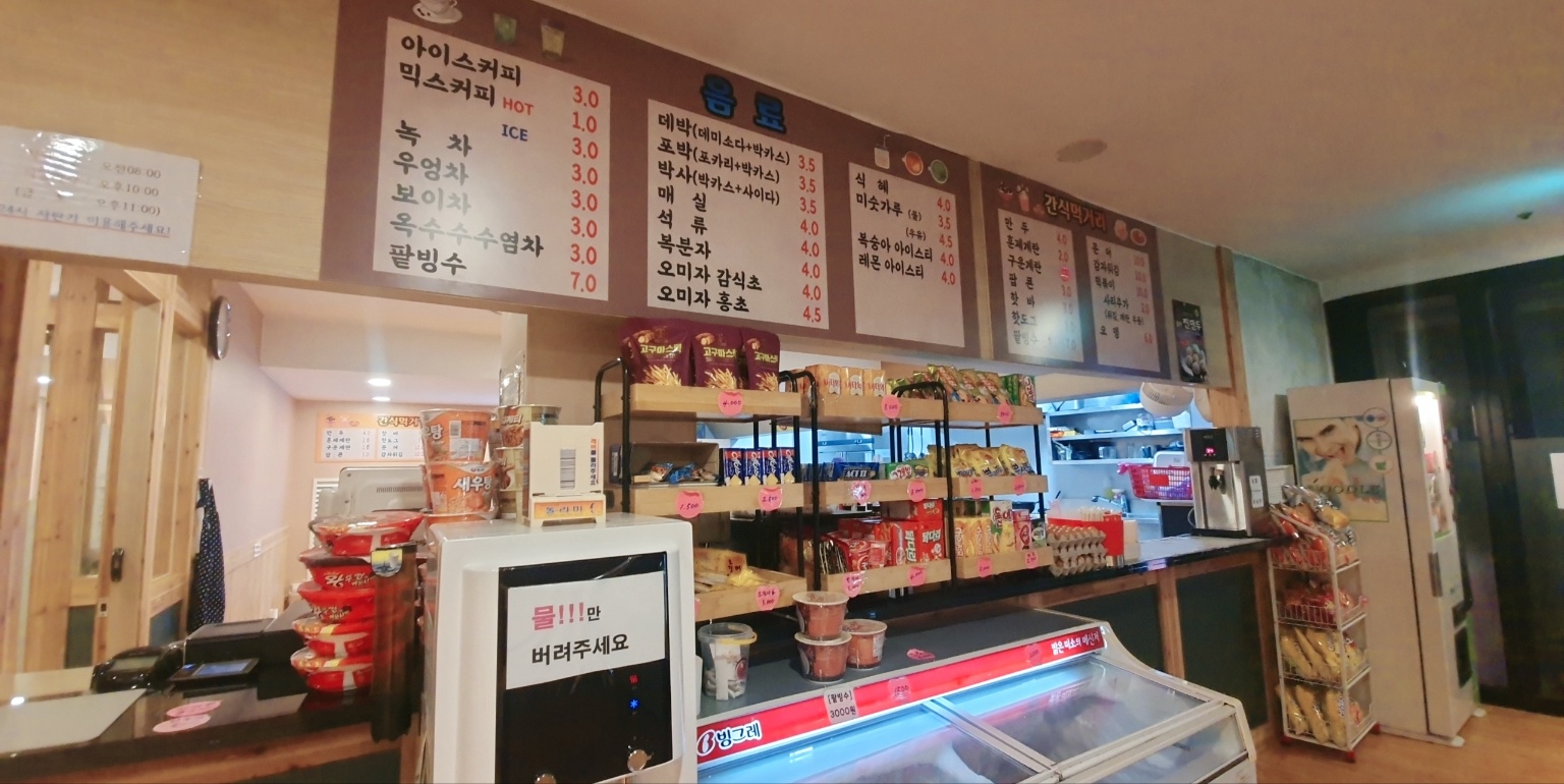 찜질방 내 왼쪽 끝으로 매점과 식당을 함께 운영하는 곳이 있습니다. 찜질방에서 기본적으로 판매하는 식혜와 커피, 삶은 계란, 과자, 아이스크림 등을 판매하고 있습니다.