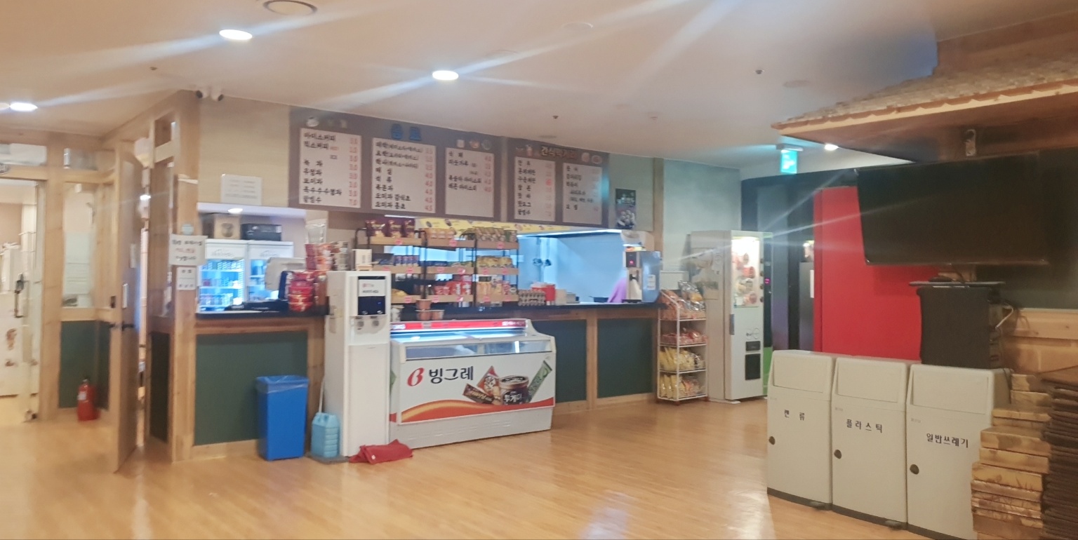 찜질방 내 왼쪽 끝으로 매점과 식당을 함께 운영하는 곳이 있습니다. 찜질방에서 기본적으로 판매하는 식혜와 커피, 삶은 계란, 과자, 아이스크림 등을 판매하고 있습니다.