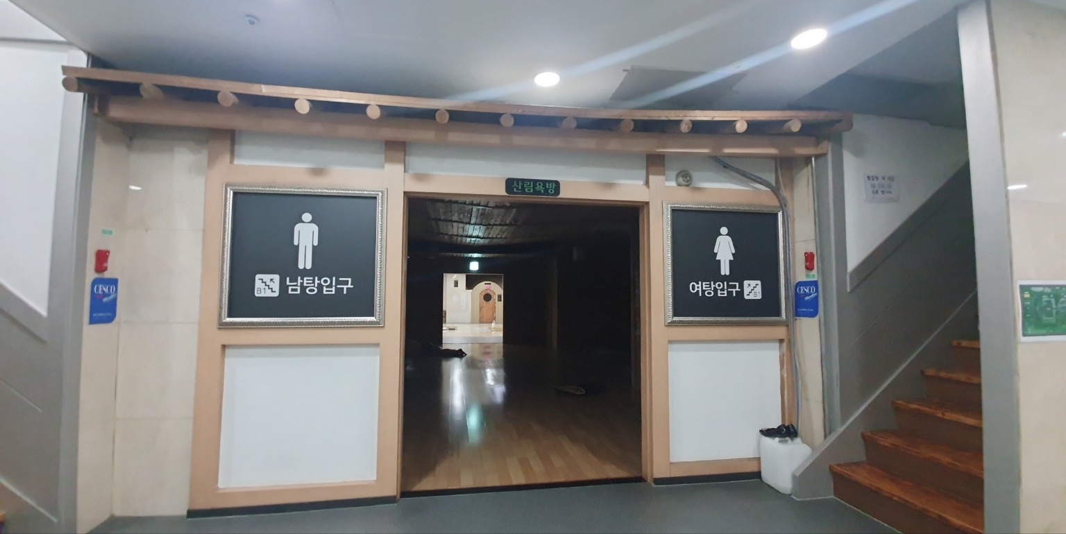 계단을 내려가면 남탕 입구를 마주하게 되고 그 가운데 <산림욕방>이 있고 이곳을 통과해서 찜질방 홀로 들어가거나 모든 곳이 연결되어 있는 복도를 통해 이동해도 됩니다.