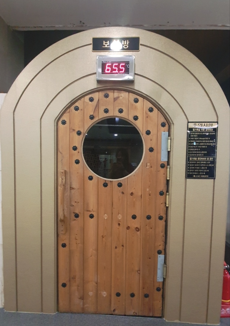 그다음으로 보석방을 향했는데 온도가!! 65.5도나 되어 들어가는 순간부터 더워서 바로 빠져나왔습니다. 안에는 여러 명이 찜질을 즐기고 있었는데 저희는 뜨거운 것이 맞지 않는 듯합니다.