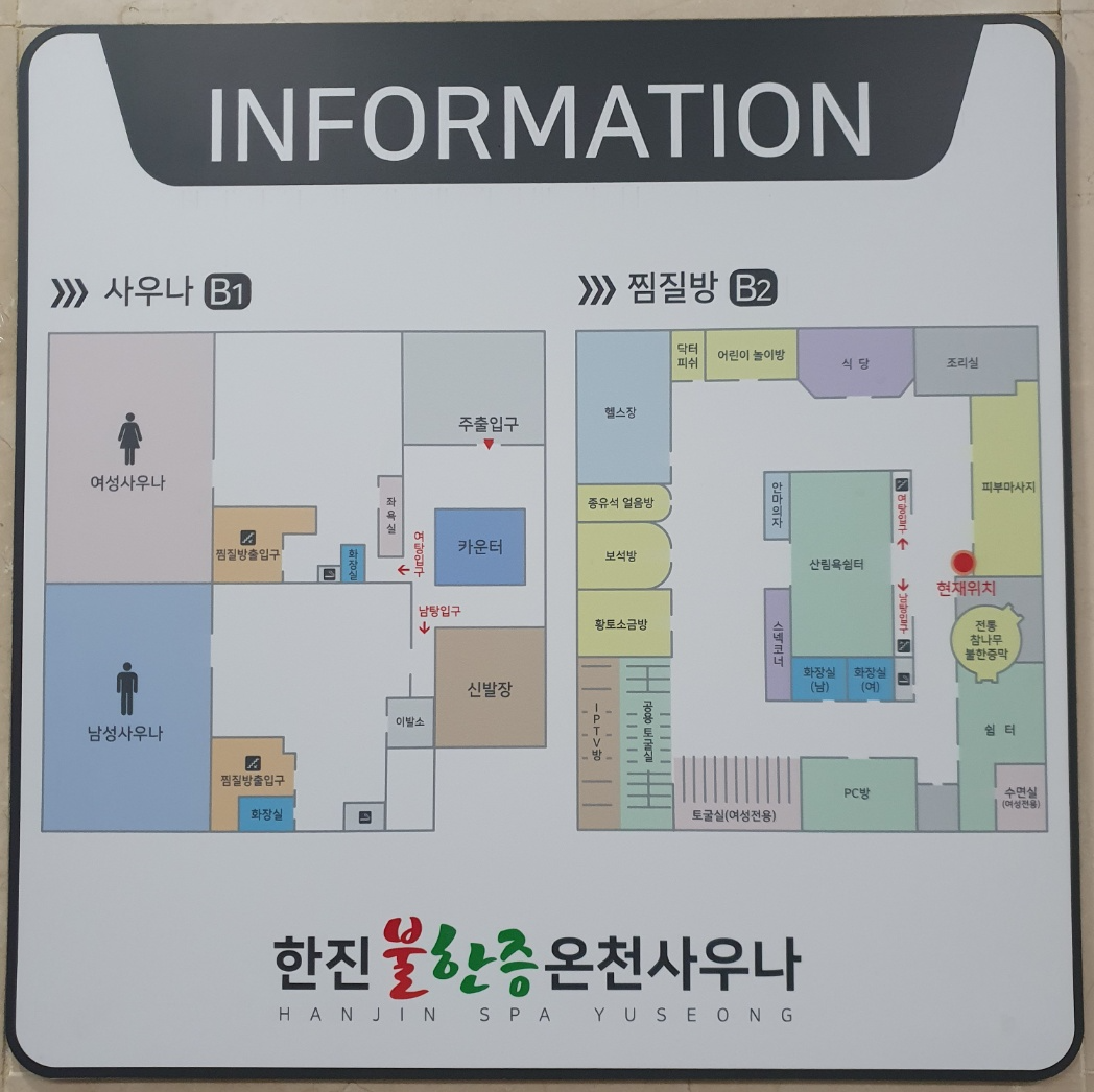 한진찜질방사우나 위치는 유성한진오피스텔 건물지하에 위치해 있으며 유성온천역 바로 근처에 있습니다. 저희는 차를 가지고 가서 주차장을 이용했는데요, 커다란 오피스텔 건물이니만큼 주차차량도 많이 있어 저희는 지하 4층에 주차를 했습니다. (주차장은 지하3층부터 지하6층까지)