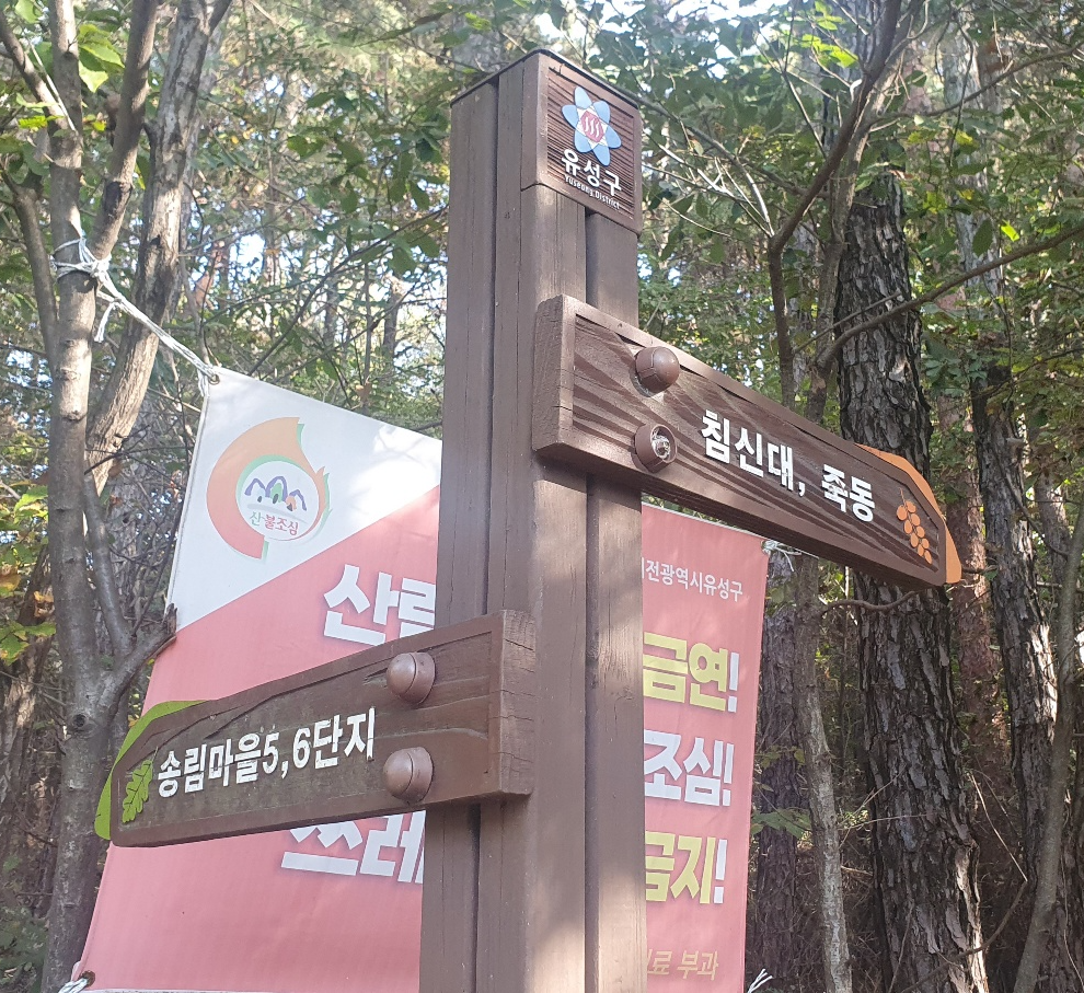 올라가면 송림마을 5, 6단지와 침신대, 죽동 방향으로 갈 수 있는 갈림길이 나옵니다. 이런 표지판은 등산하는 중간중간에서도 만나 볼 수 있습니다. 산을 빠져나올 수 있는 길을 안내해 주는 표지판이라 등산을 하다 힘드실 경우 중간에 빠져나오실 수 있습니다.