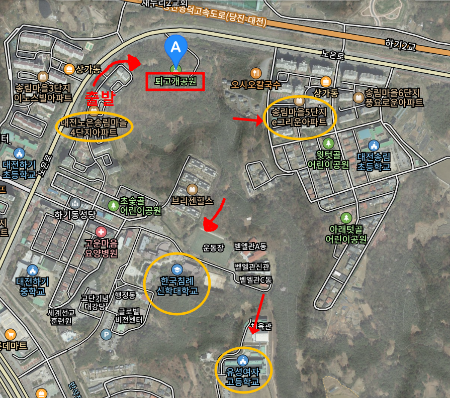 결혼 후 제주에서 대전으로 올라와서 가장 좋았던 장소 하나가 있습니다. 바로 하기동에 위치한 우리 집 뒷산입니다. 멀리 나가거나 헬스장을 다니지 않아도 집 밖을 나서기만 그날의 컨디션에 맞추어 적절한 운동을 할 수 있는 곳으로 "일주일에 한두 번 정도는 꼭 다녀와야지!" 하는 짧지만 확실히 운동되는 '퇴고개 공원'입니다.