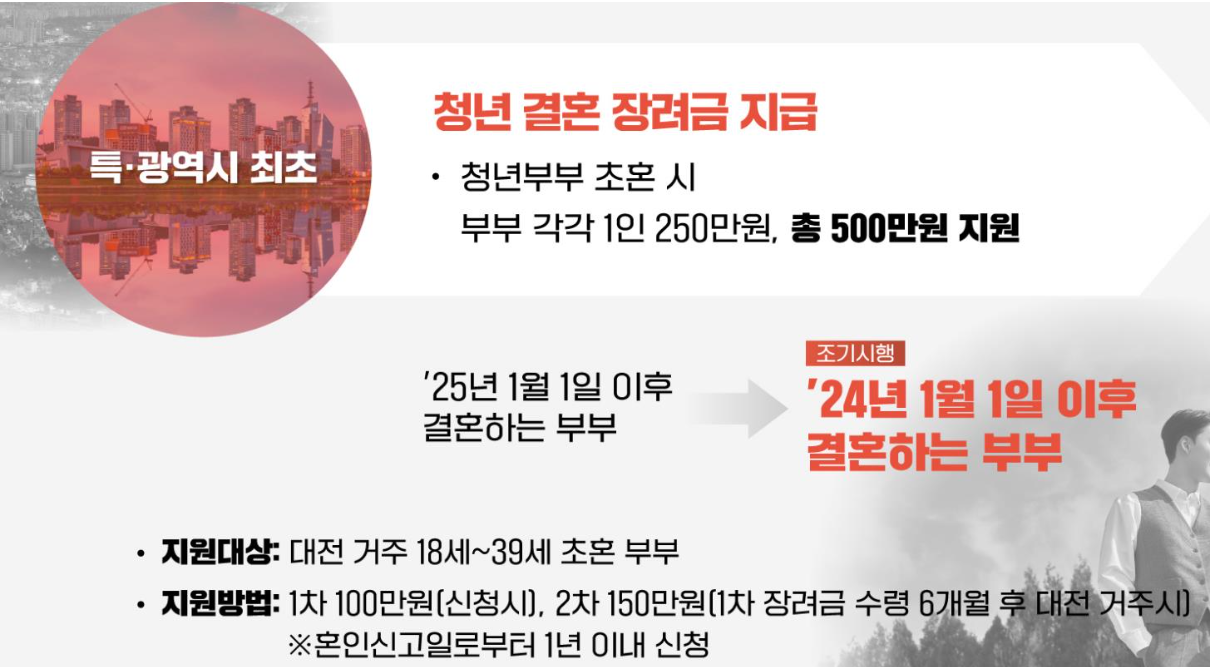 대전시는 청년들의 결혼을 권장하기 위해 전국 특·광역시 최초로 청년부부에게 최고 500만 원을 지원하는 결혼장려금을 도입했는데, 지급대상을 당초 내년(2025년 1월 1일 ) 이후 결혼하는 부부에서 올해(2024년 1월 1일) 이후 결혼하는 부부로 변경해 1년 앞당겼습니다.