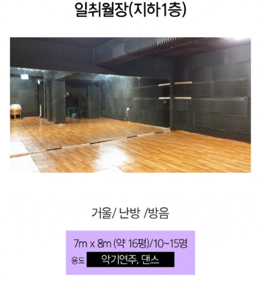 거울이 있는 공간의 '일취월장'부터 음향장비와 조명장비까지 갖추어진 '쟁이마당'과 '관용극장', 그 외에 취사가 가능한 '사랑방'과 버스킹 공연이 가능한 우금치 앞바당, 루프탑 공연장까지 무척 다양한 공연장소들이 있답니다.