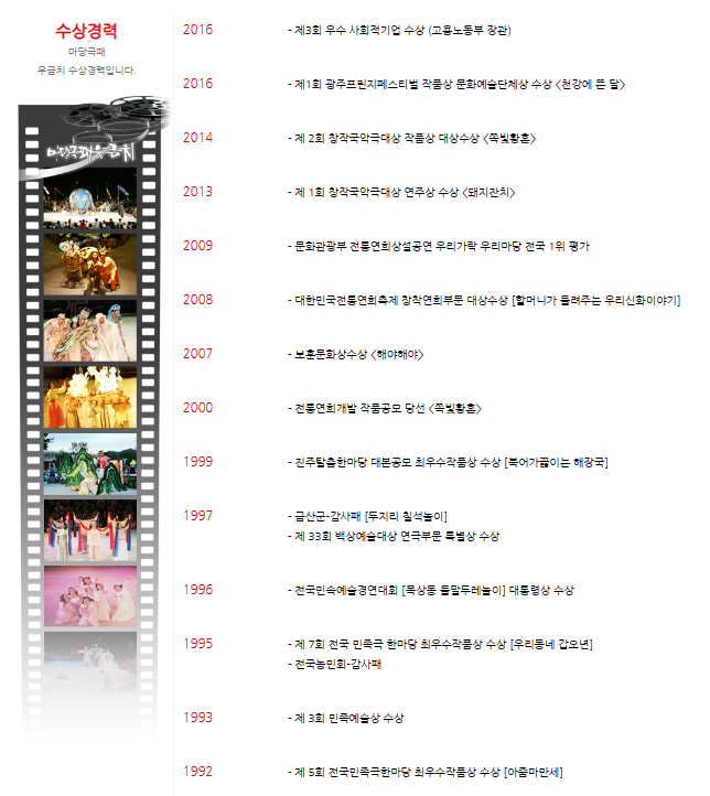 우금치는 그야말로 오래된 역사와 전통을 가지고 전국을 유랑하며 많은 공연을 펼쳤는데요, 훌륭한 작품과 단원들의 열정이 녹아든 만큼 수상경력도 상당하답니다. 믿고 볼 수 있는 공연임에 틀림없겠습니다.