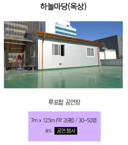 거울이 있는 공간의 '일취월장'부터 음향장비와 조명장비까지 갖추어진 '쟁이마당'과 '관용극장', 그 외에 취사가 가능한 '사랑방'과 버스킹 공연이 가능한 우금치 앞바당, 루프탑 공연장까지 무척 다양한 공연장소들이 있답니다.