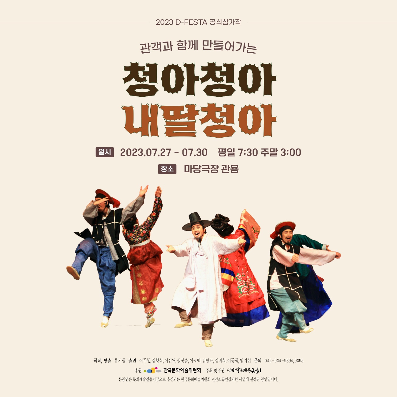 저는 이번주 주말에(2023.07. 30. 일) 우금치 관용극장에서 '청아 청아 내 딸 청아' 공연이 있어 관람하러 갈 예정인데요, 대전에 와서 우금치의 공연을 처음 접하는 것이라 무척 기대에 차 있답니다. 공연을 보고 와서 후기 포스팅 꼭! 남기도록 하겠습니다.