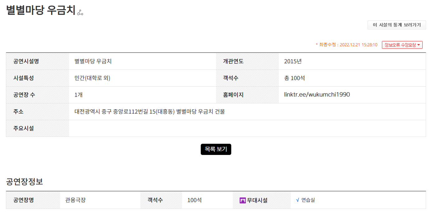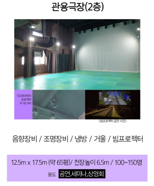 2015년 개관한 민간 시설로서 객석수 총 100석으로 되어 있는 공연장입니다.
