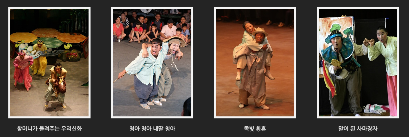 작품들을 살펴보면 광주프린지페스티벌 작품상 문화예술단체상 수상을 받은 '천강에 뜬 달', 창작국악극대상 작품상을 받은 '쪽빛황혼', 창작국악극대상 연주상 수상 작품인 '돼지잔치', 창작연희부문 대상수상 '할머니가 들려주는 우리 신화이야기' 등등 수상을 받은 작품들이 대부분 이랍니다.