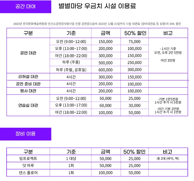 2023년 한국문화예술위원회 민간소공연장지원사업 선정 공연장으로써 2023년 12월 31일까지 시설 대관료(장비대관료 등 포함)의 50% 할인을 하고 있답니다.
