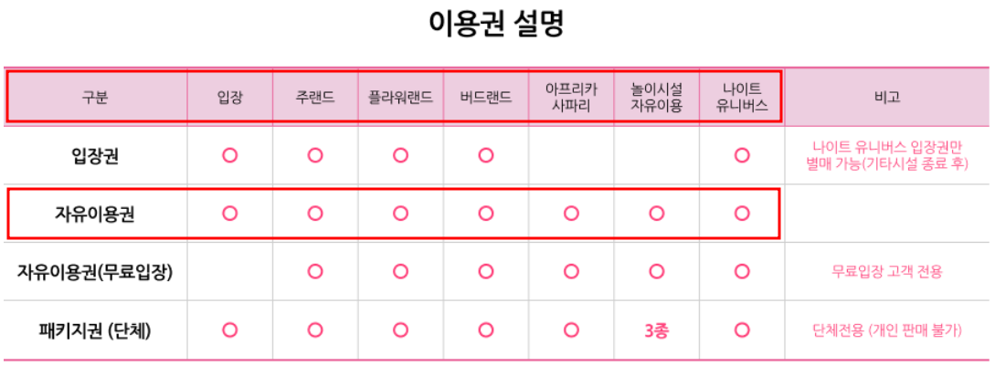 입장권만 구매하면 '아프리카 사파리'와 '놀이시설 자유이용'을 이용할 수 없습니다.