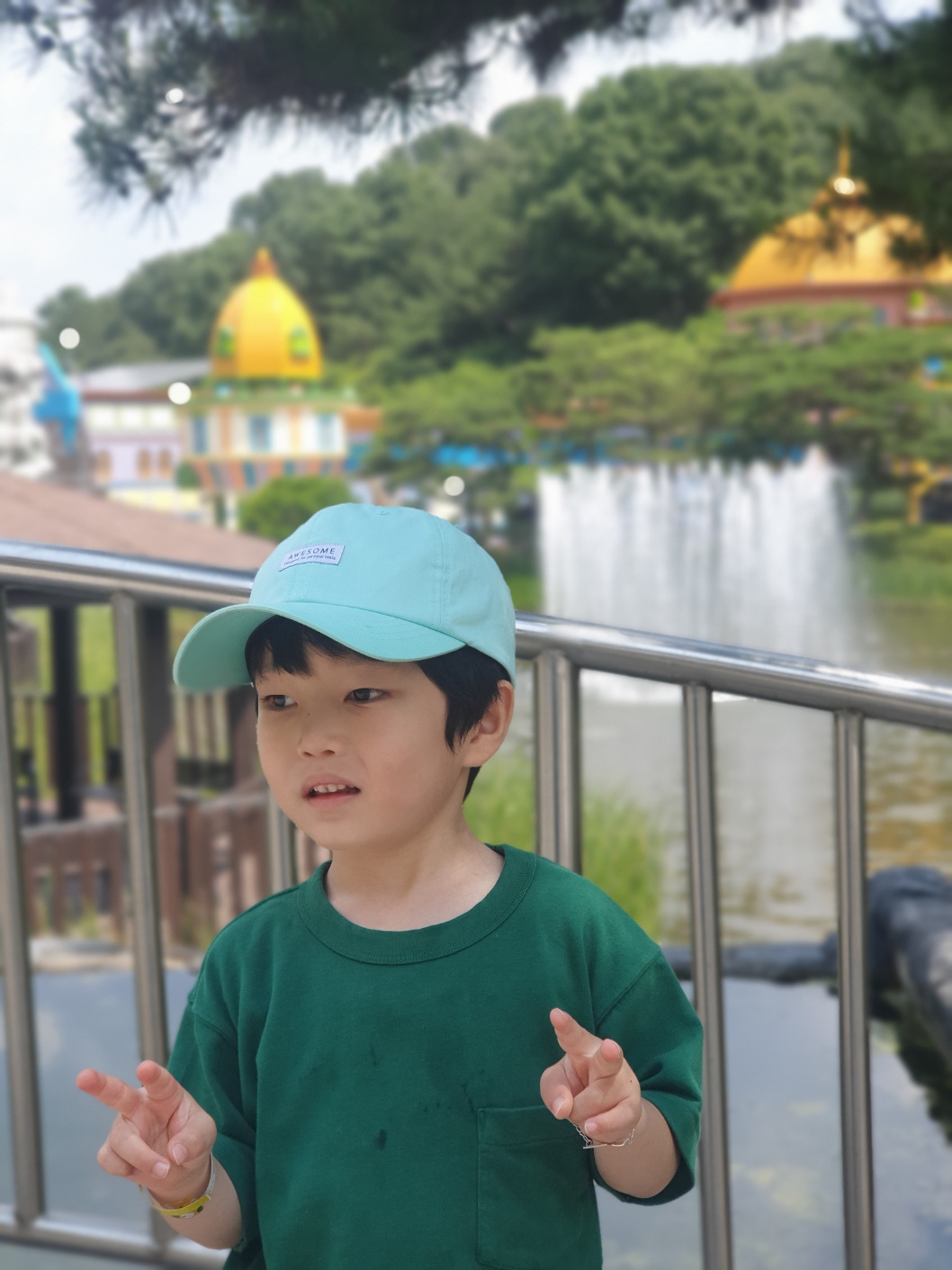 오월드 입구로 들어가면 큼직한 조형물들과 무대와 그 뒤로 분수가 나오는 연못이 보입니다. 날씨가 굉장히 더웠는데 분수가 있어 조금은 열을 식혀주는 것 같습니다.