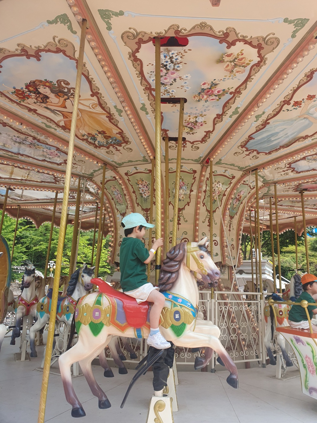 입장해서 보니 아직 어린아이들이 탈 수 있는 어린이 전용 놀이기구들이 11시에 탈 수 있다고 해서 그전부터 탈 수 있는 회전목마를 가장 먼저 타보았습니다. 언제 봐도 멋스러운 놀이기구라 생각합니다.