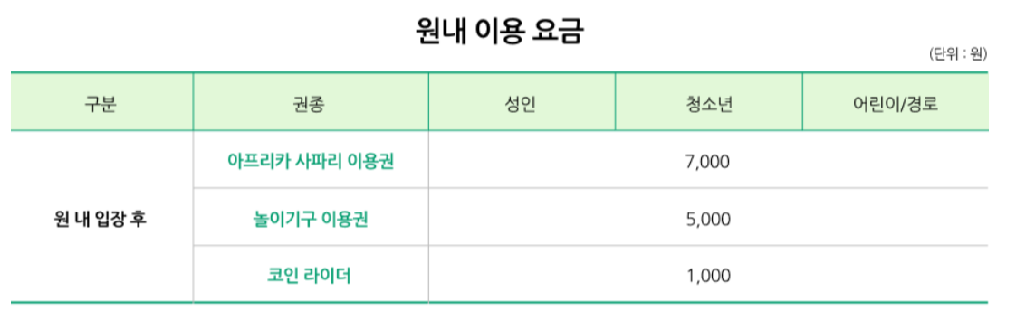 만약에 입장권만 구매하시고 들어갔는데 아프리카 사파리와 놀이시설을 타고 싶은 생각이 든다면 입장 후 요금을 내면 이용할 수 있으므로 크게 걱정하지 않으셔도 됩니다.