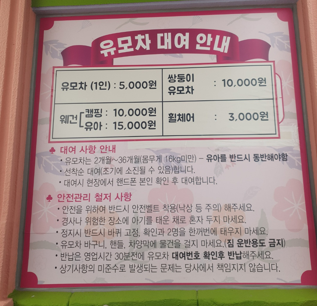 유모차 대여 비용과 안내사항이 벽면에 붙여져 있으니 대여하시는 분들은 꼭 한 번씩 읽고 대여하시기 바랍니다.