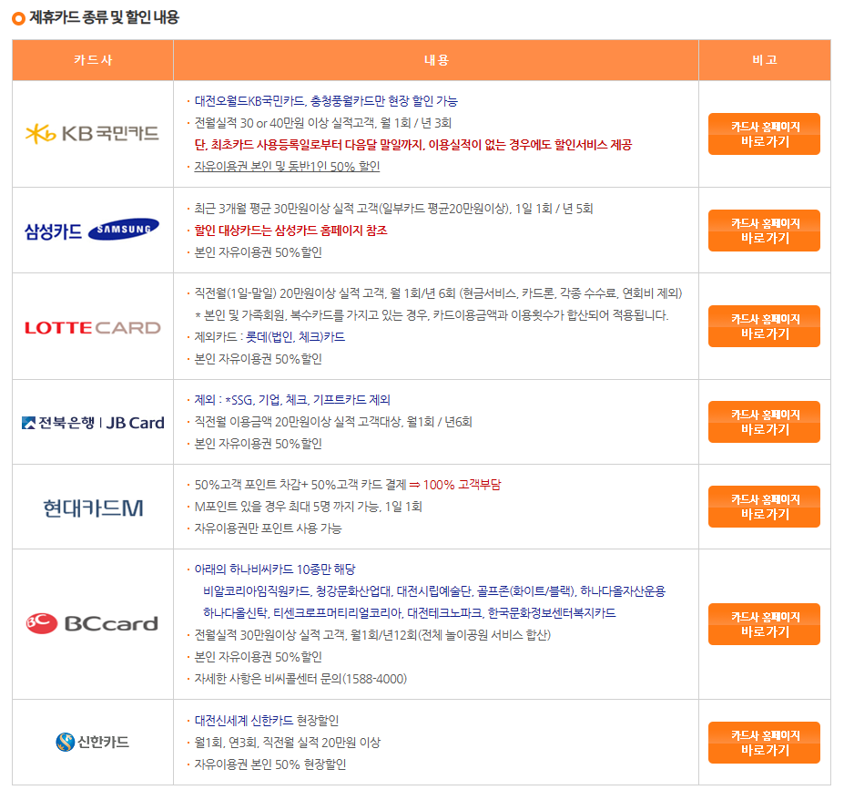 #제휴카드를 가지고 있다면 최대 50%까지 할인을 받을 수 있으니 내가 가지고 있는 카드를 꼭 한번 확인해 보시면 좋겠습니다.