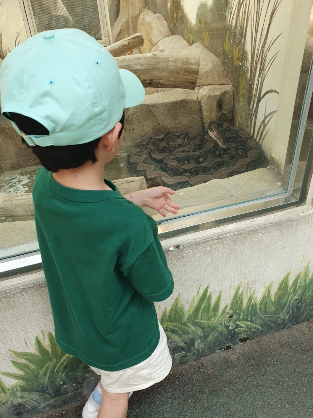 다양한 파충류들이 있는 파충류관입니다. 똬리를 뜬 커다란 뱀이 등골을 오싹하게 만듭니다. 저희 조카는 무서워하지 않는 것 같아 보이네요.