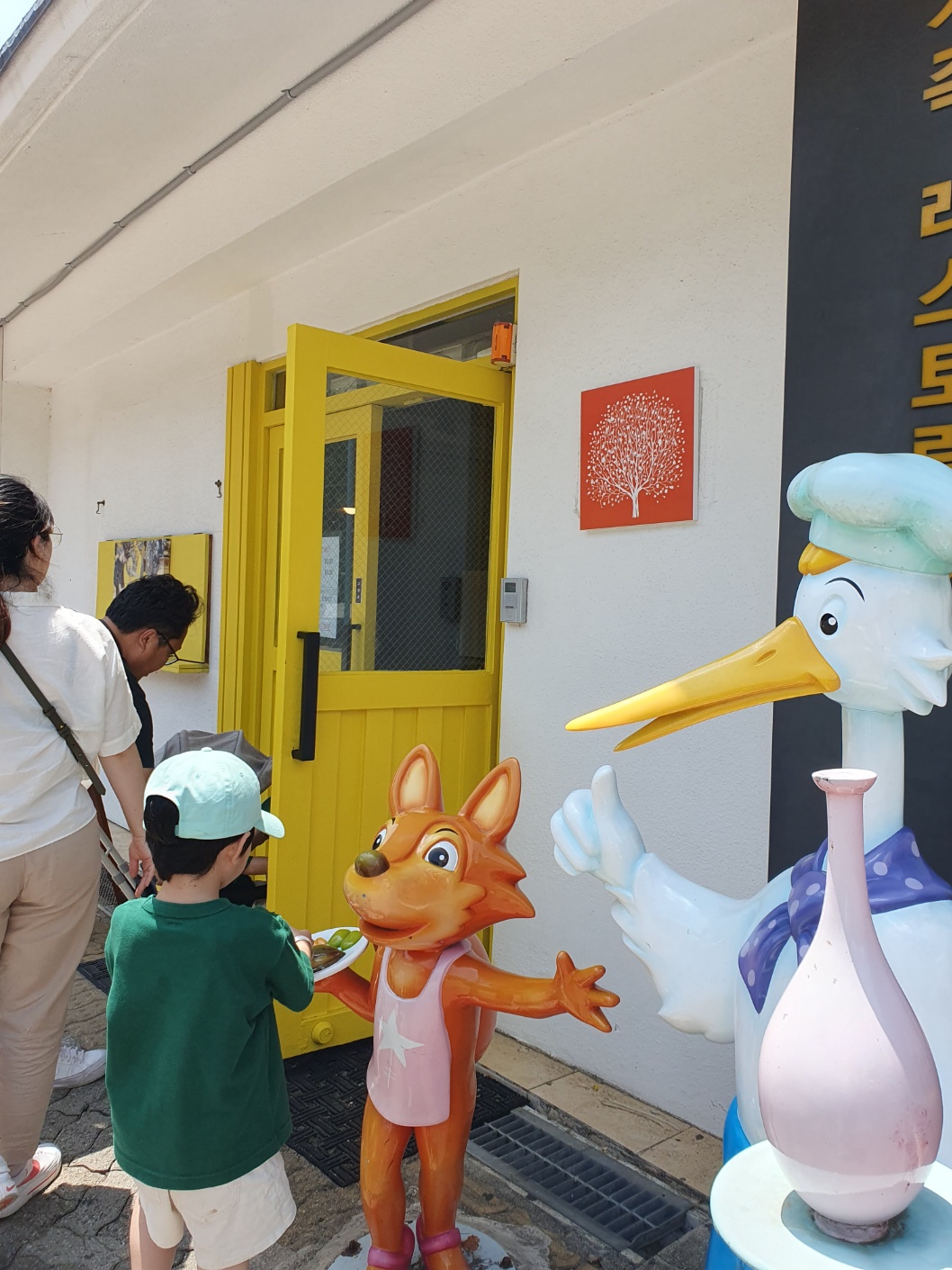 오월드 입구로 들어가면 큼직한 조형물들과 무대와 그 뒤로 분수가 나오는 연못이 보입니다. 날씨가 굉장히 더웠는데 분수가 있어 조금은 열을 식혀주는 것 같습니다.