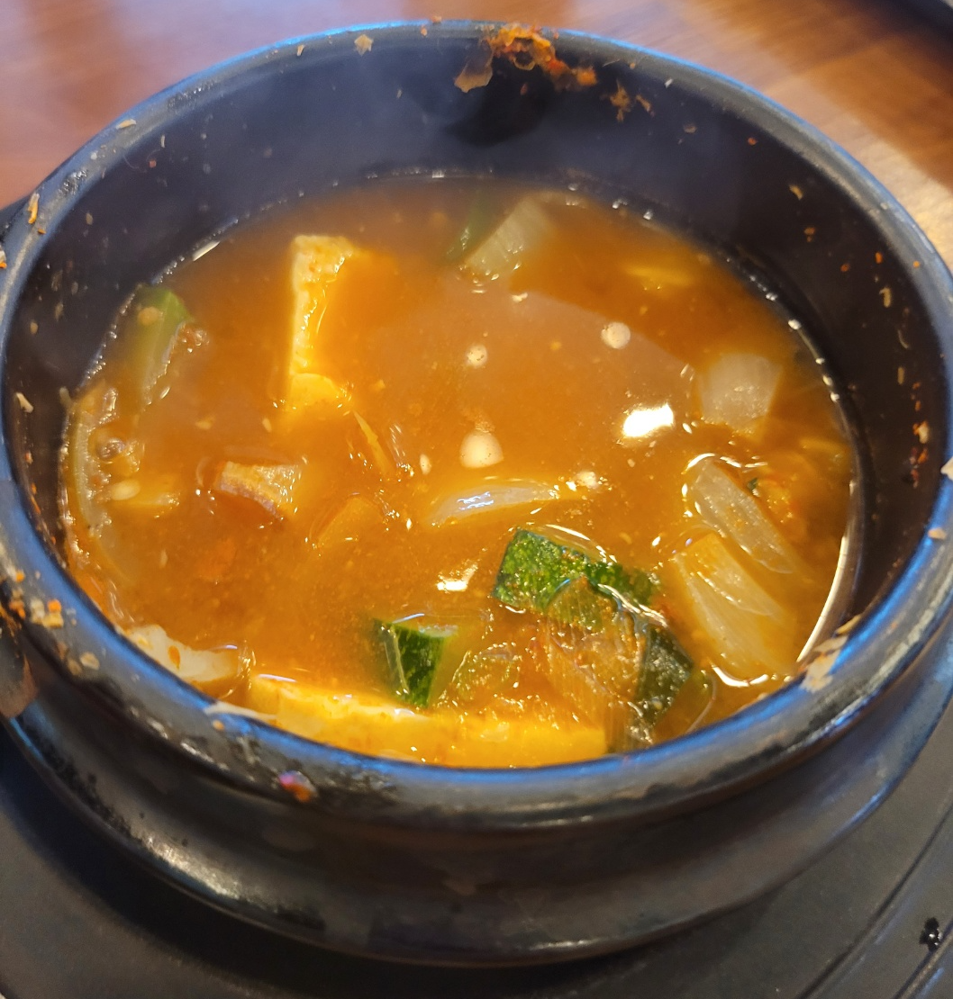 찌게 정말 맛있습니다! 칼칼하게 매운 국물에 두부, 양파, 애호박이 들어있어 먹어도 먹어도 계속 먹을 수 있는 그런 맛입니다. 쌀밥에 소고기 한점 올려 먹고, 찌게 한 숟갈 떠서 먹으면 얼마나 맛있게요~ 그리고 추운 계절에는 서비스로 가리비도 넣어주시고 따로 구워서 먹을 수 있게 챙겨주신답니다.