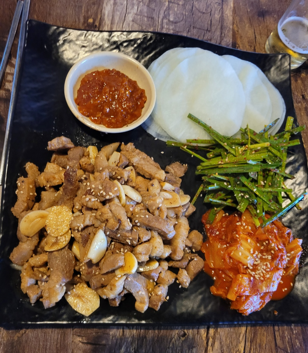 저희는 고기 쪽을 좋아해서 '오븐목살'을 주문했습니다. 시원한 술도 빠뜨릴 수 없겠죠?