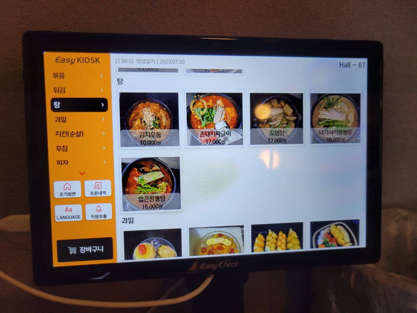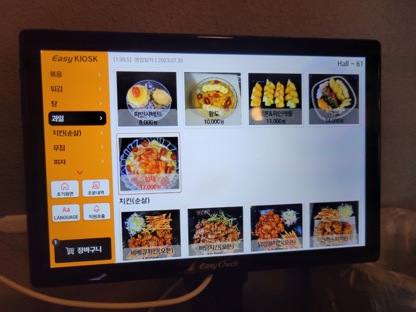각각의 테이블에 주문을 할 수 있는 태블릿이 배치되어 있습니다. 볶음 메뉴부터 튀김 탕, 과일, 치킨에 피자까지 준비되어 있습니다.