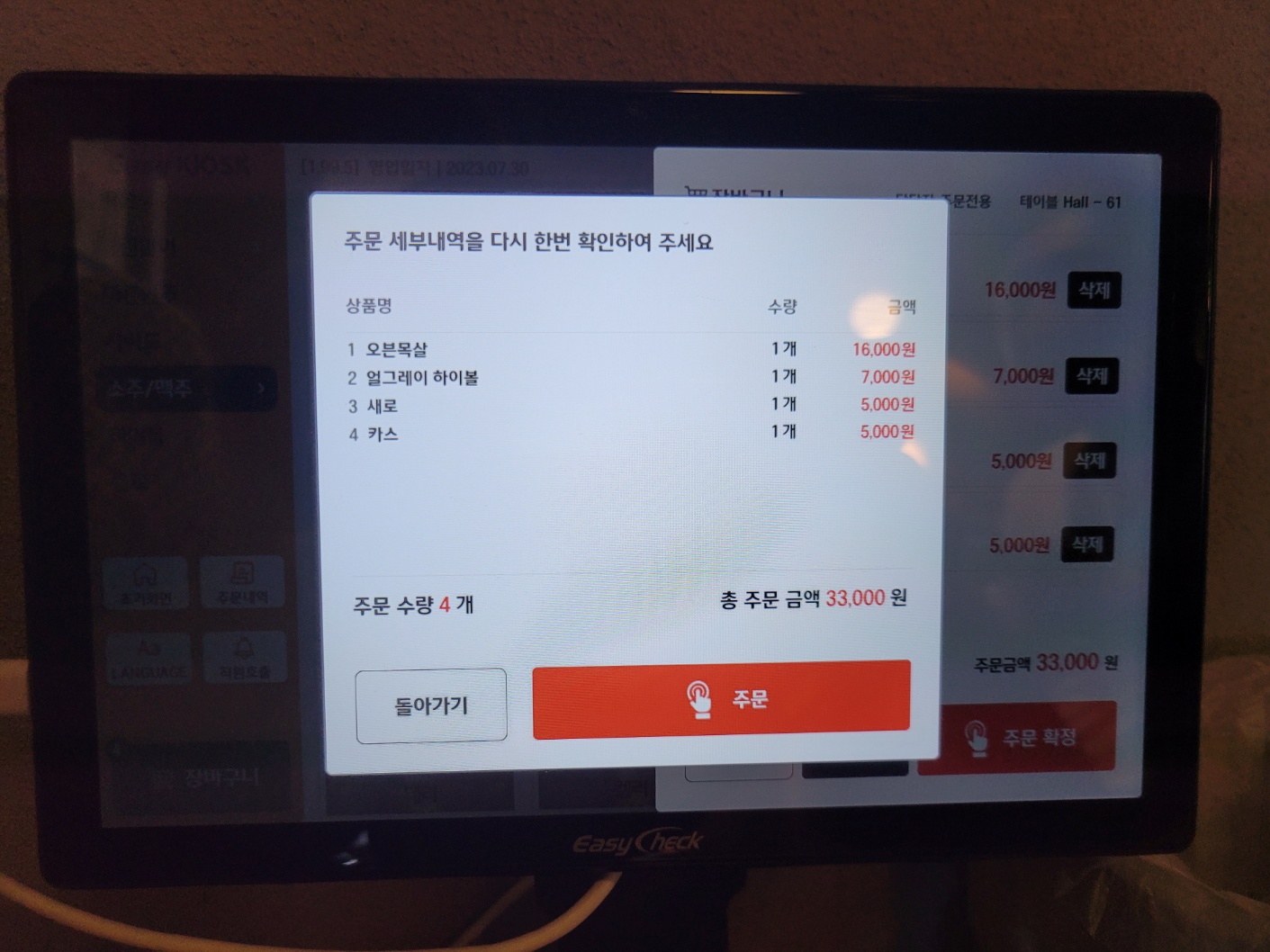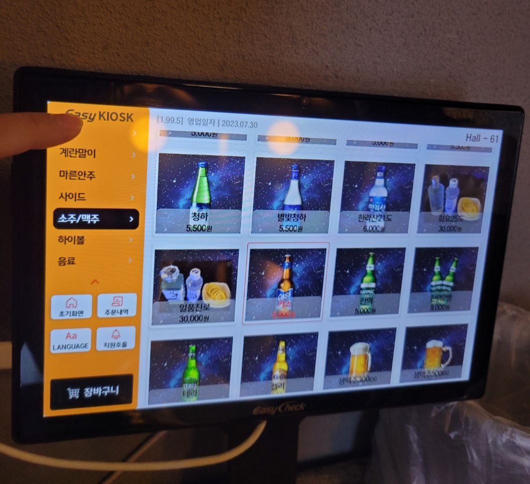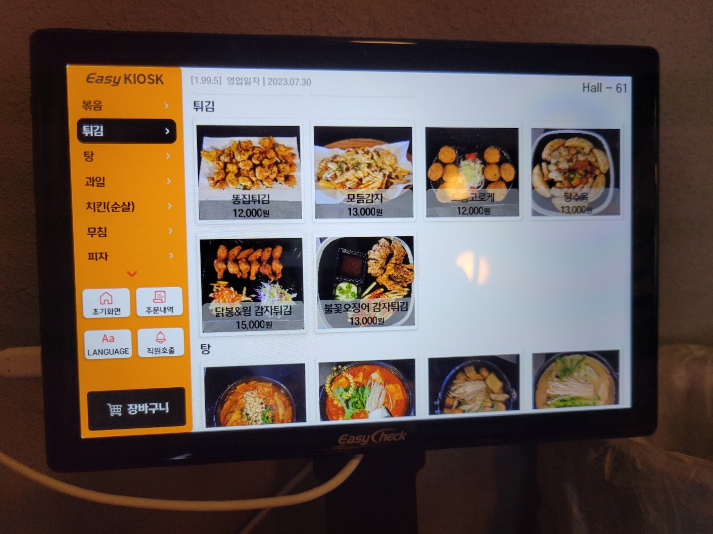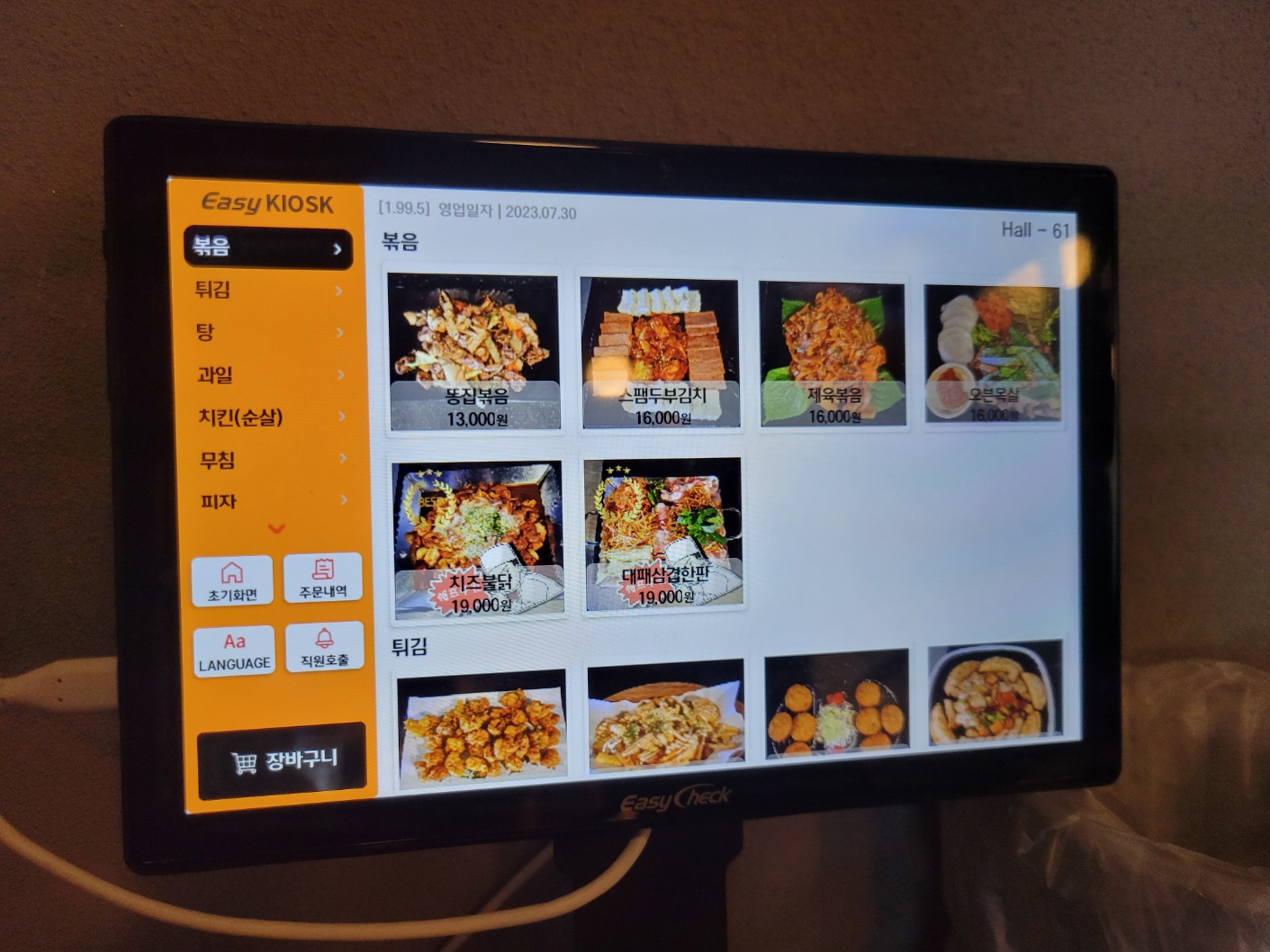 각각의 테이블에 주문을 할 수 있는 태블릿이 배치되어 있습니다. 볶음 메뉴부터 튀김 탕, 과일, 치킨에 피자까지 준비되어 있습니다.