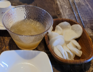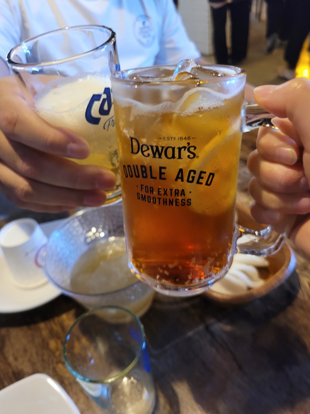 기본 안주로는 과자와 시원한 동치미 국물? 냉면육수 가 한 그릇 나옵니다. 뒤를 이어 주문한 얼그레이 하이볼과 소주와 맥주가 나와 바로 시원하게 짠~