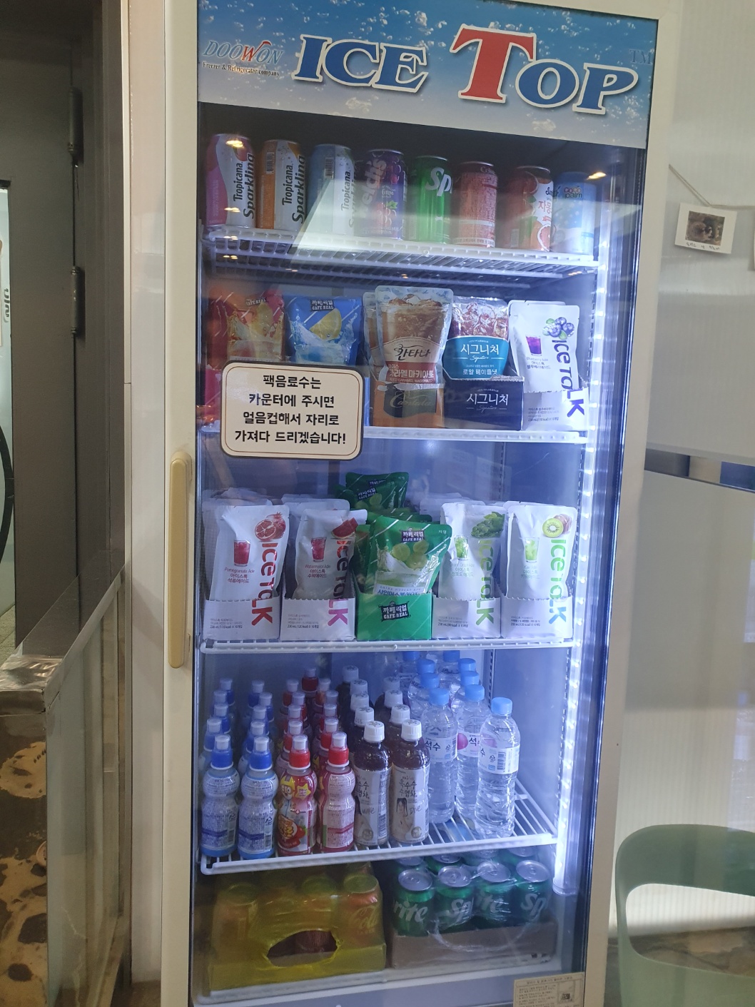 음료는 냉장고에 있는 음료 중에 하나를 선택하면 되는데요, 남편은 아메리카노, 저는 샤인머스킷 주스를 골라 직원분께 드리니 얼음컵에 담아주시고 가져다주셨답니다.