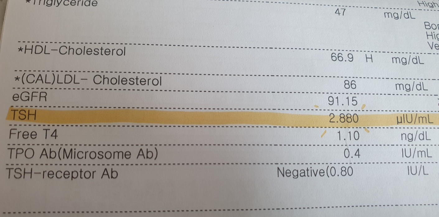 TSH수치와 다른 수치들도 모두 정상이라고 말씀해 주셨는데 컨디션에 따라 수치가 변동 되기도 하니 앞으로도 추적검사를 정기적으로 받아 잘 확인 해야 한다고 말씀해 주셨습니다.