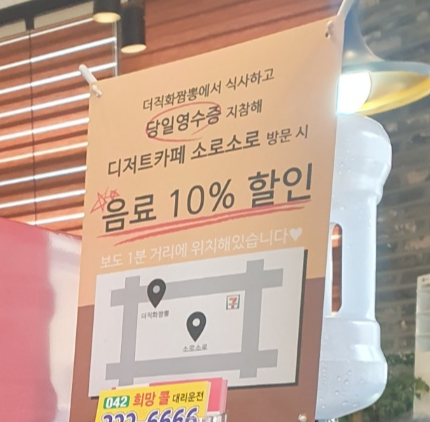 '더직화짬뽕에서 식사를 하고 당일영수증을 지참해 디저트카페 소로소로 방문 시 음료 10% 할인 혜택'이 있었네요!! 나중에 사진으로 봐서 놓쳤지만 다음번 방문 때는 디저트카페까지 죽~ 이어서 방문해야겠습니다.