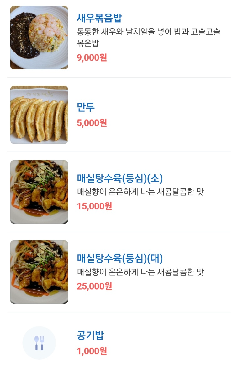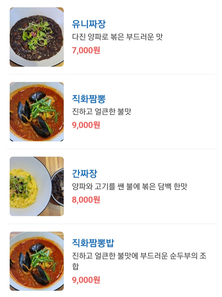 메뉴를 살펴보면 유니짜장, 간짜장을 시작으로 대표메뉴인 직화짬뽕이 보이고 직화짬뽕밥, 새우볶음밥, 매실탕수육, 만두가 있습니다. 메뉴가 일반 중국집에 비해 다양하진 않지만 정말 딱 갖추어져야 할 음식들로 구성되어 있습니다. 그리고 메뉴 가장 마지막에 공기밥 1,000원이라고 보이는데 이곳은 셀프바가 있어 공깃밥도! 반찬도 모두 무료입니다.