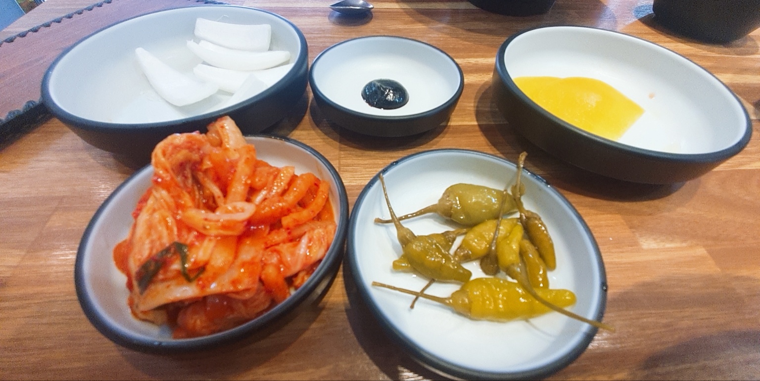기본 찬을 보면 단무지와 양파가 나오는데 저희는 셀프바를 이용해 배추김치와 고추장아찌를 추가로 가져다 먹었습니다.