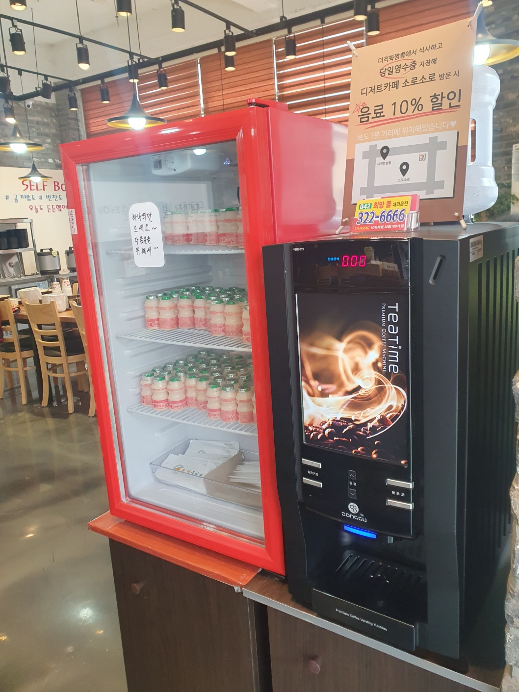 식사 후에는 달달한 디저트도 준비되어 있습니다. 카운터 옆쪽 작은 냉장고가 있는데 그 안에는 요구르트가 채워져 있습니다. 1인 한 개씩으로 후식 무료제공이니 입가심할 겸 챙겨 먹었답니다. 오랜만에 먹는 작은 요구르트. 역시 맛있네요.