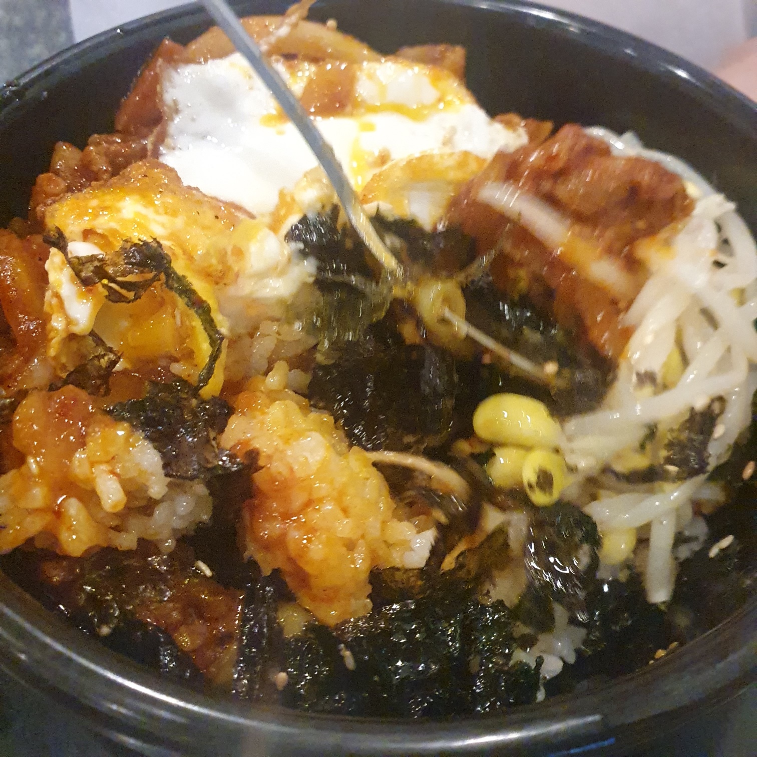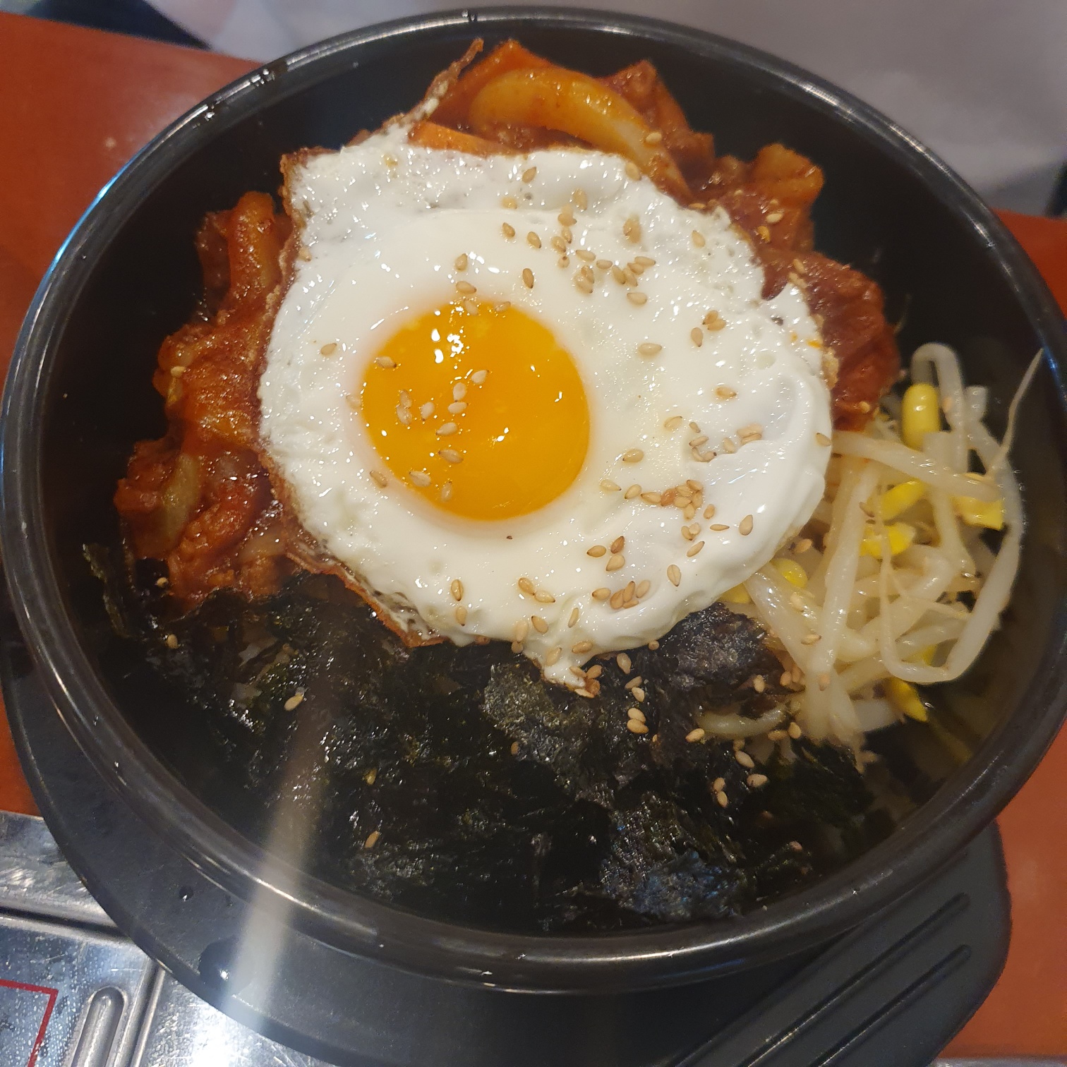 돌솥제육입니다. 달콤한 냄새를 풍기며 알맞게 익힌 달걀이 먹음직스럽습니다. 제육볶음과 채소가 들어있어 한 끼를 해결하기에 좋은 메뉴인데 평범한 제육맛이었답니다.