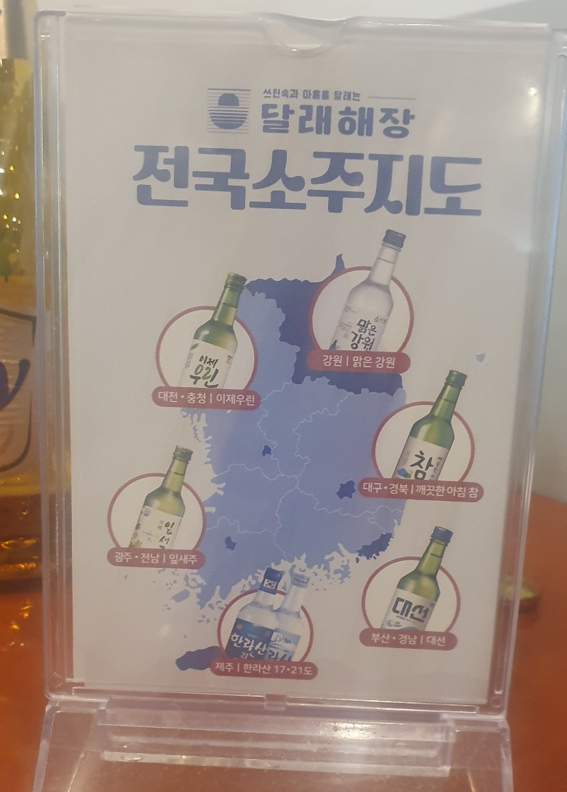 테이블 위에는 전국 소주가 그려진 지도가 올려져 있는데 이곳에서는 다양한 지역 술과 함께 막걸리도 판매하고 있었답니다.