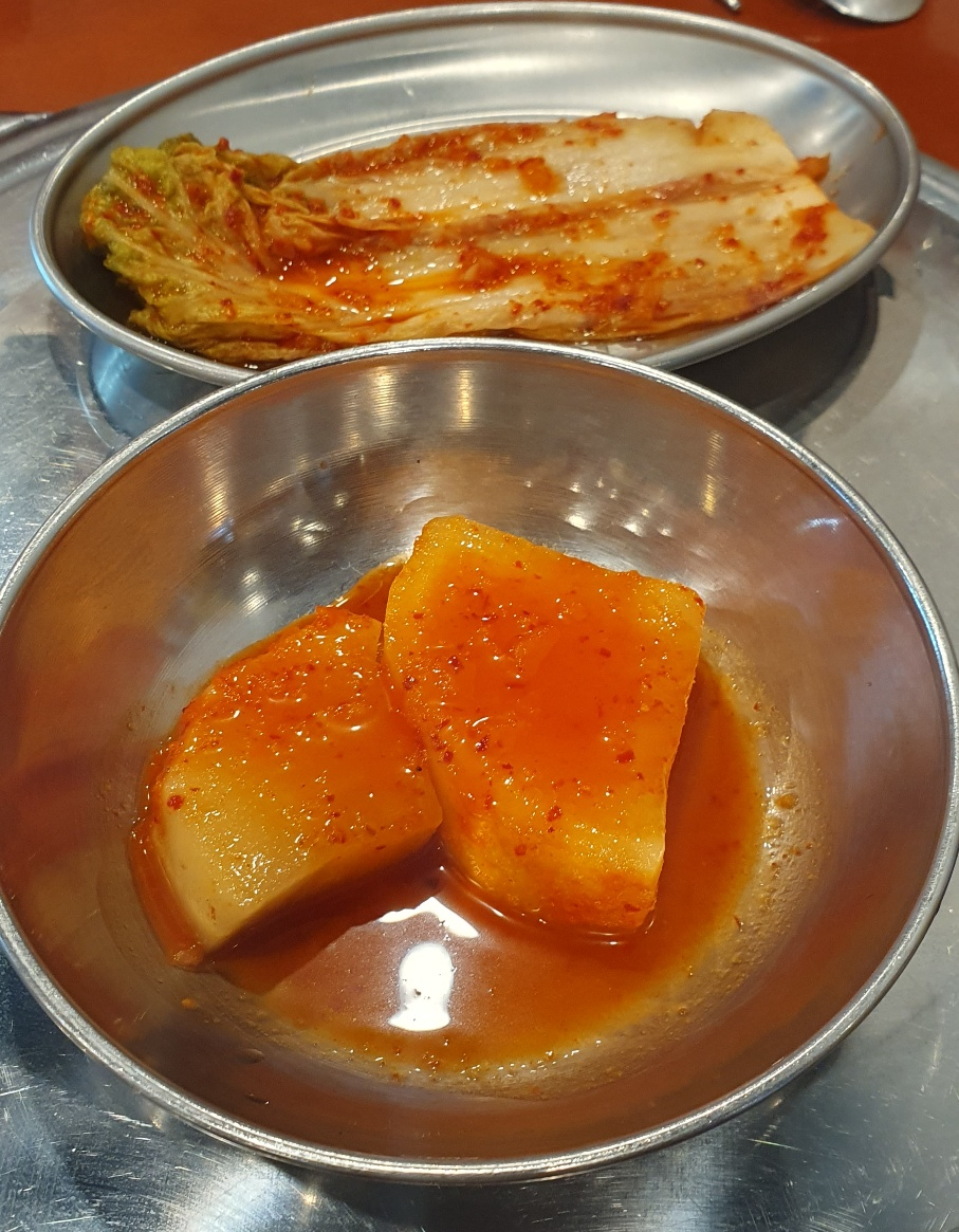 주문을 하면 기본 찬으로 큼직한 깍두기와 배추김치가 나옵니다. 보기만 해도 침이 꿀꺽~ 넘어갔는데요, 저는 배추김치보다 깍두기가 더 맛있었답니다.