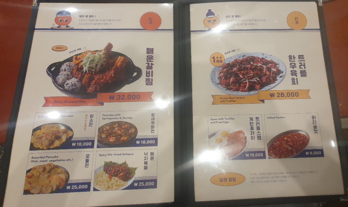 매장 입구에 '낮술 환영'이라는 베너를 보고 웃어넘겼는데 술과 어울리는 메뉴들이 많아서 '식사하러 왔다가 술을 찾는 분들이 많겠구나~' 싶었답니다. 저희도 간단히 먹고 가려했는데 소주를 부르는 해장국과 맛있는 안주들로 달려달려~~