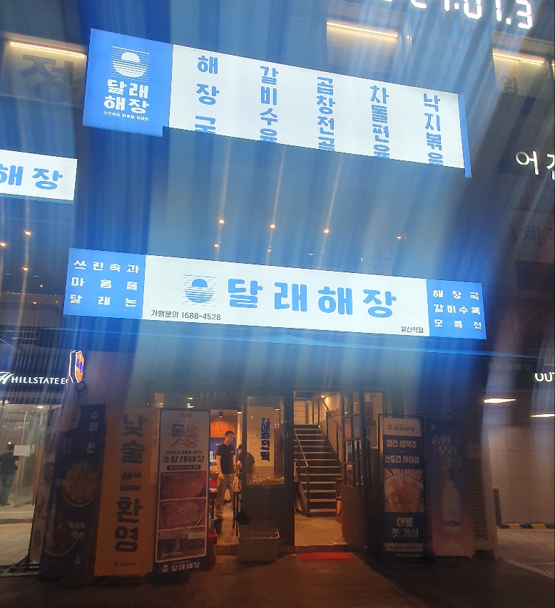 놀기를 포기하고 숙소로 곧장 이동, 숙소 근처에서 저녁을 먹기 위해 식당을 찾던 중 눈에 들어온 파란색 밝은 빛을 내뿜는 '달래해장' 간판을 보고 해장국을 좋아하는 우리기에 고민 없이 식당으로 향했답니다.